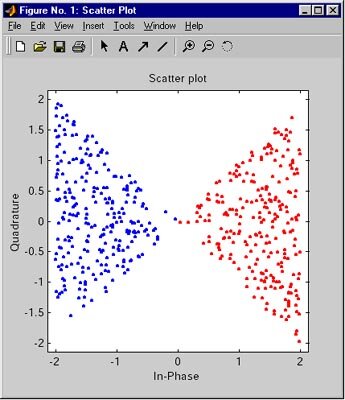 Преобразует сигнал, используя "концентрическое" созвездие квадратурной манипуляции (КАМн). Параметры numsig, amp и phs должны быть векторами одинаковой длины. Элементы векторов numsig и amp должны быть положительными числами. Если k - целое число из диапазона [1, length(numsig)], то amp(k) - радиус k-й окружности, numsig(k) - число точек созвездия, лежащих на этой окружности, а phs(k) - фаза первой точки, лежащей на k-й окружности. Все точки, лежащие на одной окружности, распределены на ней равномерно. Если параметр phs не указан, его значение по умолчанию равно numsig*0. Если не указан и параметр amp, его значение по умолчанию равно [1:length(numsig)]. Примечание. Чтобы узнать, как именно символы передаваемого дискретного сообщения отображаются в точки "концентрического" созвездия, можно вывести соответствующий рисунок с помощью функции apkconst(numsig,amp,phs,'n'). Примеры. Приведенный ниже сценарий показывает, какие области на плоскости в координатах (синфазная амплитуда - квадратурная амплитуда) соответствуют разным символам цифрового сообщения при использовании 4-позиционной ФМн. Для этого формируются случайно расположенные на плоскости точки, с помощью функции demodmap они преобразуются в символы сообщения. Далее точки, отображенные функцией в символ 0, выводятся на график красным цветом, а в символ 2 - синим. Горизонтальная ось соответствует синфазной амплитуде, вертикальная - квадратурной.