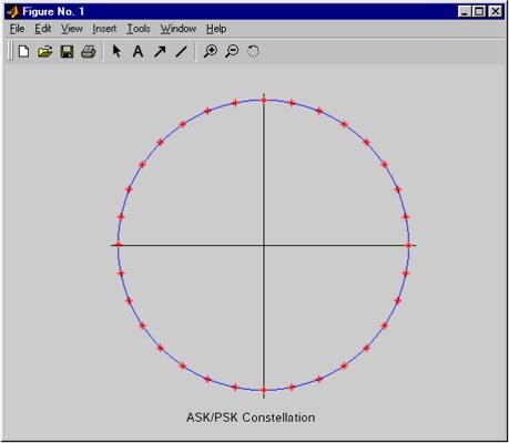 Преобразует сигнал, используя "концентрическое" созвездие квадратурной манипуляции (КАМн). Параметры numsig, amp и phs должны быть векторами одинаковой длины. Элементы векторов numsig и amp должны быть положительными числами. Если k - целое число из диапазона [1, length(numsig)], то amp(k) - радиус k-й окружности, numsig(k) - число точек созвездия, лежащих на этой окружности, а phs(k) - фаза первой точки, лежащей на k-й окружности. Все точки, лежащие на одной окружности, распределены на ней равномерно. Если параметр phs не указан, его значение по умолчанию равно numsig*0. Если не указан и параметр amp, его значение по умолчанию равно [1:length(numsig)]. Примечание. Чтобы узнать, как именно символы передаваемого дискретного сообщения отображаются в точки "концентрического" созвездия, можно вывести соответствующий рисунок с помощью функции apkconst(numsig,amp,phs,'n'). Примеры. Приведенная ниже команда выводит график сигнального созвездия 32-позиционной фазовой манипуляции (ФМн). modmap('psk',32);