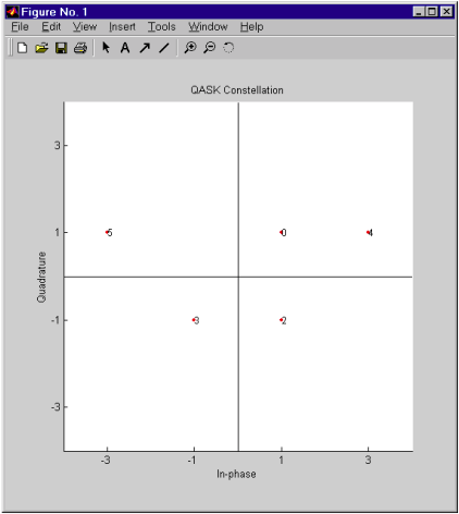 Приведенная ниже команда вместо построения графика возвращает ту же информацию в виде векторов inphase и quadr. [inphase,quadr] = qaskenco([0 3 5 3 2 5],8); inphase' ans = 1 -1 -3 -1 1 -3 quadr' ans = 1 -1 1 -1 -1 1 Приведенная ниже команда возвращает в векторах [inphase2,quad2] = qaskenco(8); |