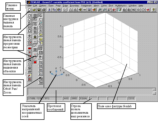 В этом подразделе раскрываются аспекты трехмерного моделирования в пределах GUI-приложения femlab. Существенная часть того, что было сказано относительно двумерного графического интерфейса, является применимым в трехмерном. Главные различия между трехмерным и двумерным графическими интерфейсами заключаются в моделировании геометрии, в возможностях визуализации трехмерной геометрии и в методах выделения объектов. Общий вид фигуры femlab в трёхмерном режиме моделирования показан на рис. 1.43.