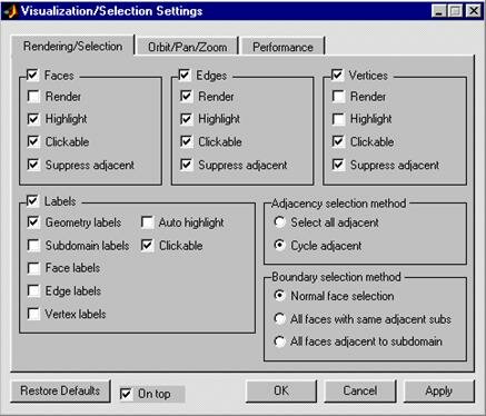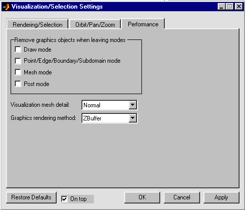 Общий вид диалогового окна Visualization/Selection Settings с раскрытой закладкой Performance показан на рис. 1.47. Эта закладка предназначена для управления памятью при работе GUI-приложения femlab с графическими объектами (группа флажков Remove graphics objects when leaving modes). В этой закладке есть также два ниспадающих меню, одно из которых управляет выбором графического режима, другое предлагает выбор режима визуализации граней и рёбер.