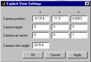 Закладка Orbit/Pan/Zoom состоит из группы радиокнопок Mouse movement action, группы флажков и ниспадающих меню Lighting, ниспадающего меню Projection и строки редактирования Transparency. Есть также отдельная кнопка Explicit View Settings. Радиокнопки None, Orbit, Pan, Zoom, Dolly horiz/vert, Dolly in/out, Orbit scenelight, флажки Move as box, Scenelight, Headlight, ниспадающее меню Projection полностью дублируют соответствующие кнопки инструментальной панели Orbit/Pan/Zoom. Ниспадающее меню Lighting model позволяет выбрать модель освещённости отображаемых поверхностей. Оно предлагает выбор из трёх моделей: Flat, Gouraud, Phong. Эти три модели отличаются друг от друга шагом дискретизации по освещённости (самый большой у Flat, самый маленький у Phong). Ниспадающее меню Reflection предлагает выбор одной из четырёх моделей отражения света от отображаемой поверхности: Default, Dull, Metal, Shiny (отражающие поверхности посветлее или потемнее). Строка редактирования Transparency предназначена для управления непрозрачностью отображаемых поверхностей. Непрозрачность может изменяться в пределах от 0 до 1. Реально она регулируется только в графическом режиме OpenGL. В режиме ZBuffer эта строка редактирования доступна, но значение непрозрачности игнорируется. Нажатие кнопки Explicit View Settings приводит к развёртыванию диалогового окна, изображённого на рис. 1.46. Это окно содержит числовые параметры положения камеры наблюдения расчётной области.