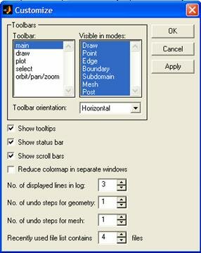Группа флажков Remove graphics objects when leaving modes позволяет пользователю указать, при завершении каких режимов работы GUI-приложения femlab нужно освободить память, занимаемую графическими объектами. Освобождение памяти может немного замедлить переключение режимов моделирования, зато оно экономит значительные объёмы памяти, необходимой для решения краевой задачи. Ниспадающее меню Graphics rendering method позволяет выбрать графический режим (метод отображения графических объектов на экране монитора). Максимальными возможностями обладает режим OpenGL, однако для работы он требует максимальный объём памяти (в т.ч. и на видеокарте). Более экономичным с точки зрения требований к памяти является режим ZBuffer, который обычно устанавливается по умолчанию. При запуске решения краевой задачи полезно переходить в режим ZBuffer. Ниспадающее меню Visualization mesh detail предлагает выбор режима визуализации граней и рёбер. На экране монитора все поверхности изображаются кусочно-плоскими, а линии (рёбра) – кусочно-линейными. Режимы визуализации отличаются друг от друга шагом пространственной дискретизации при отображении. Расположим режимы визуализации в порядке уменьшения шага дискретизации, а, значит, и улучшения качества изображения: Extra Coarse (очень крупный), Coarse (крупный), Normal (нормальный), Fine (улучшенный), Finer (прекрасный), Extra Fine (очень прекрасный). По умолчанию обычно устанавливается режим Normal. Указанные здесь режимы визуализации никак не влияют на точность расчётов, т.к. они никак не связаны с пространственной конечноэлементной дискретизацией расчётной области. Отображение больших геометрических моделей Рассмотрим некоторые приёмы экономии памяти ЭВМ, которые могут быть полезны при работе с большими моделями на компьютере с ограниченными вычислительными ресурсами. Прежде всего, полезно экономить память, требуемую для отображения геометрии расчётной области. Наибольшее количество памяти требуется для отображения граней. Чтобы отключить отображение граней, нужно в закладке Rendering/Selection диалогового окна Visualization/Selection Settings отключить флажки Render Faces, Highlight Faces и даже Clickable Faces (см. рис. 1.44). Чтобы геометрия при этом была показана в каркасном виде, нужно флажок Render Edges включить. Необходимо помнить также и о том, что если грани были один раз показаны, то при отмене режима их показа память не освобождается (соответствующие графические объекты остаются в памяти ЭВМ). Режим визуализации граней и рёбер Visualization mesh detail также влияет требуемый объём памяти. Меньше всего памяти требуется в режиме Extra Coarse (очень крупный). Описанные выше приёмы экономят память в том случае, если рекомендуемые настройки установлены до создания первого геометрического объекта. Если Вам в ходе прорисовки геометрии, всё же, пришлось использовать высококачественные графические режимы (особенно, OpenGL, который захватывает наибольший объём памяти), то для экономии памяти при решении краевой задачи необходимо воспользоваться закладкой Performance диалогового окна Visualization/Selection Settings. В группе флагов Remove graphics objects when leaving modes в этом случае нужно установить все флаги или часть их (особенно Draw mode). Некоторую экономию памяти даёт также уменьшение размеров фигуры femlab. Для экономии памяти можно воспользоваться также командой меню Options/ Customize. Выполнение данной команды приведёт к развёртыванию диалогового окна Customize (рис. 1.48). В 
