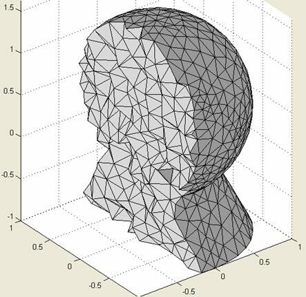 Диалоговое окно, изображённое на рис. 1.49, имеет три группы элементов управления: Path plot (сплошная визуализация сетки), Wireframe plot (каркасная визуализация), Element Selection (показ только выделенных конечных и граничных элементов). Если любой из трёх флагов Path Plot, Wireframe plot, Element Selection сброшен, то соответствующая группа элементов управления становится заблокированной. Флаги внутри этих групп указывают, какие элементы сетки надо показывать в поле axes. Для примера установим флаги Path plot, Element Selection, в строку редактирования Logical expression for inclusion впишем логическое выражение x>=-0.3. Остальные параметры визуализации пусть будут как на рис. 1.49. В этом случае в поле axes будет картина конечноэлементной сетки, изображённая на рис. 1.50.