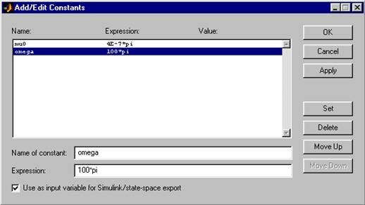 Femlab 2.3. Руководство пользователя (перевод с английского с редакторской правкой В.Е.Шмелева): В оглавление книги \ К следующему разделу \ К предыдущему разделу 1.6.6. Константы По команде меню Options/ Add/Edit Constants разворачивается диалоговое окно Add/Edit Constants, вид которого показан на рис. 1.91. Это диалоговое окно позволяет создавать новые константы модели и редактировать определяющие выражения уже существующих констант. Константы определяются на всей рабочей области, а если модель мультигеометрическая, то на всех геометриях. Константы имеют глобальное значение для всей модели FEMLAB. Любой глобальный параметр модели, не зависящий от времени и от пространственных координат, может быть оформлен как именованная константа (это, например, могут быть угловая частота, абсолютная магнитная проницаемость вакуума и др.). Определение именованных констант облегчает проведение вычислительных экспериментов, связанных с исследованием влияния параметров на моделируемые процессы.