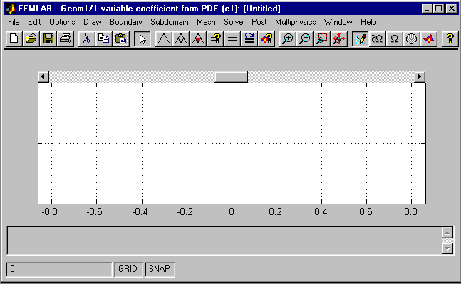 Femlab 2.3. Руководство пользователя (перевод с английского с редакторской правкой В.Е.Шмелева): В оглавление книги \ К следующему разделу \ К предыдущему разделу 1.7.3. Построение геометрии в одномерной расчётной области Одномерный режим моделирования инициализируется Навигатором моделей. Как было сказано ранее, в закладке New Навигатора есть группа радиокнопок Dimension выбора размерности пространства расчётной области. Включим радиокнопку 1D и выберем прикладной режим PDE Modes/ Coefficient/ Linear Stationary (рис. 1.152). Нажатие кнопки OK приведёт к переходу GUI-приложения femlab в одномерный режим моделирования.