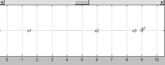 Технология создания геометрических объектов предельно проста. Вписываем имя объекта в строку редактирования Name. Вписываем начальное и конечное значения координаты x в строки редактирования Start и Stop. Нажимаем кнопку Set, в результате чего имя объекта и его параметры появятся в окне списка объектов. Такими действиями можно создать произвольное число объектов. В одномерном режиме моделирования поддерживается два типа объектов - солидные и точечные. Выше описаны действия по созданию солидных объектов - отрезков. Для создания точечного объекта нужно установить флажок Enter points. Если этот флаг установлен, то строка редактирования Stop блокируется. Точечные объекты, как правило, выполняют роль границ раздела зон расчётной области, а также реперных точек в расчётной области. Нажатие кнопки Apply приводит к построению объектов в расчётной области без закрытия диалогового окна. Нажатие кнопки Cancel отменяет действия, выполненные с момента раскрытия окна или с момента последнего нажатия кнопки Apply, и приводит к закрытию диалогового окна. Нажатие кнопки OK аналогично нажатию кнопки Apply, только диалоговое окно закрывается. Пример изображения геометрии расчётной области показан на рис. 1.155.