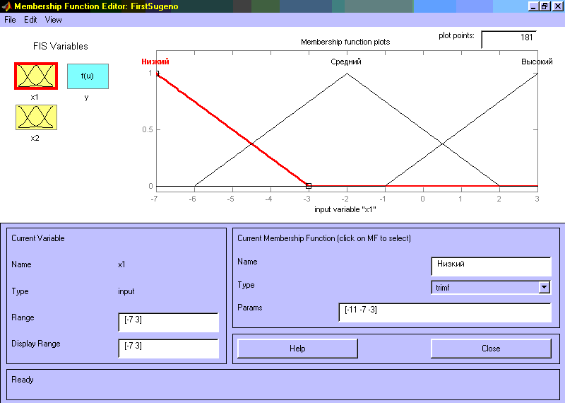 Проектирование системы нечеткого логического вывода типа Сугэно состоит в выполнении следующей последовательности шагов. Шаг 1. Для загрузки основного fis-редактора напечатаем слова fuzzy в командной строке. После этого откроется нового графическое окно, показанное на рис. 3.2. Шаг 2. Выберем тип системы. Для этого в меню File выбираем в подменю New fis… команду Sugeno. Шаг 3. Добавим вторую входную переменную. Для этого в меню Edit выбираем команду Add input. Шаг 4. Переименуем первую входную переменную. Для этого сделаем один щелчок левой кнопкой мыши на блоке input1, введем новое обозначение x1 в поле редактирования имени текущей переменной и нажмем <Enter>. Шаг 5. Переименуем вторую входную переменную. Для этого сделаем один щелчок левой кнопкой мыши на блоке input2, введем новое обозначение x2 в поле редактирования имени текущей переменной и нажмем <Enter>. Шаг 6. Переименуем выходную переменную. Для этого сделаем один щелчок левой кнопкой мыши на блоке output1, введем новое обозначение y в поле редактирования имени текущей переменной и нажмем <Enter>. Шаг 7. Зададим имя системы. Для этого в меню File выбираем в подменю Export команду To disk и введем имя файла, например, FirstSugeno. Шаг 8. Перейдем в редактор функций принадлежности. Для этого сделаем двойной щелчок левой кнопкой мыши на блоке x1. Шаг 9. Зададим диапазон изменения переменной x1. Для этого напечатаем -7 3 в поле Range (см. рис. 3.9) и нажмем <Enter>.