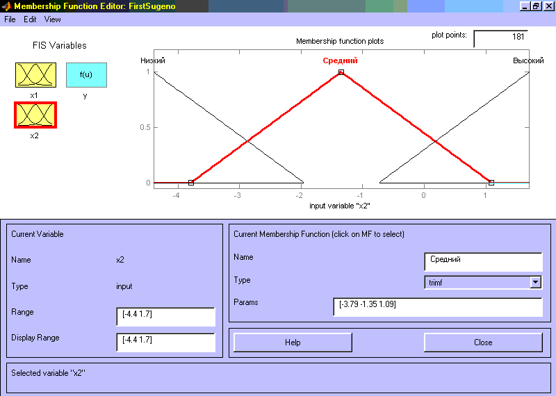 Рис 3.9. Функции принадлежности переменной x1 Шаг 10. Зададим функции принадлежности переменной x1. Для лингвистической оценки этой переменной будем использовать, 3 терма с треугольными функциями принадлежности, которые установлены по умолчанию. Зададим наименования термов переменной x1. Для этого делаем один щелчок левой кнопкой мыши по графику первой функции принадлежности (см. рис. 3.9). Затем напечатаем наименование терма Низкий в поле Name. Затем делаем один щелчок левой кнопкой мыши по графику второй функции принадлежности и вводим наименование терма Средний в поле Name. Еще раз делаем один щелчок левой кнопкой мыши по графику третьей функции принадлежности и вводим наименование терма Высокий в поле Name и нажмем <Enter>. В результате получим графическое окно, изображенное на рис. 3.9. Шаг 11. Зададим функции принадлежности переменной x2. Для лингвистической оценки этой переменной будем использовать 3 терма с треугольными функциями принадлежности, которые установлены по умолчанию. Для этого активизируем переменную x2 с помощью щелчка левой кнопки мыши на блоке x2. Зададим диапазон изменения переменной x2. Для этого напечатаем -4.4 1.7 в поле Range (см. рис. 3.10) и нажмем <Enter>. По аналогии с предыдущим шагом зададим следующие наименования термов переменной x2: Низкий, Средний, Высокий. В результате получим графическое окно, изображенное на рис. 3.10.