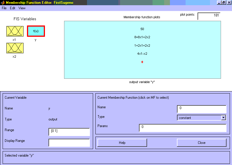 Рис 3.10. Функции принадлежности переменной x2 Шаг 12. Зададим линейные зависимости между входами и выходом, приведенные в базе знаний. Для этого активизируем переменную y с помощью щелчка левой кнопки мыши на блоке y. В правом верхнем угле появилось обозначение трех функций принадлежности, каждая из которых соответствует одной линейной зависимости между входами и выходам. В базе знаний, приведенной в начале подраздела 3.2 указаны 5 различных зависимостей: y=50; y=4x1-x2; y=2x1+2x2+1; y=8x1+2x2+8; y=0. Поэтому добавим еще две зависимости путем выбора команды Add Mfs… меню Edit. В появившимся диалоговом окне в поле Number of MFs выбираем 2 и нажимаем кнопку OK. Шаг 13. Зададим наименования и параметры линейных зависимостей. Для этого делаем один щелчок левой кнопкой мыши по наименованию первой зависимости mf1. Затем печатаем наименование зависимости, например 50, в поле Name, и устанавливаем тип зависимости – константа путем выбора опции Сonstant в меню Type. После этого вводим значение параметра – 50 в поле Params. Аналогично для второй зависимости mf2 введем наименование зависимости, например 8+8x1+2x2. Затем укажем линейный тип зависимости путем выбора опции Linear в меню Type и введем параметры зависимости 8 2 8 в поле Params. Для линейной зависимости порядок параметров следующий: первый параметр – коэффициент при первой переменной, второй – при второй и т.д., и последний параметр – свободный член зависимости. Аналогично для третьей зависимости mf3 введем наименование зависимости, например 1+2x1+2x2, укажем линейный тип зависимости и введем параметры зависимости 2 2 1. Для четвертой зависимости mf4 введем наименование зависимости, например 4x1-x2, укажем линейный тип зависимости и введем параметры зависимости 4 -1 0. Для пятой зависимости mf5 введем наименование зависимости, например 0, укажем тип зависимости - константа и введем параметр зависимости 0. В результате получим графическое окно, изображенное на рис. 3.11.