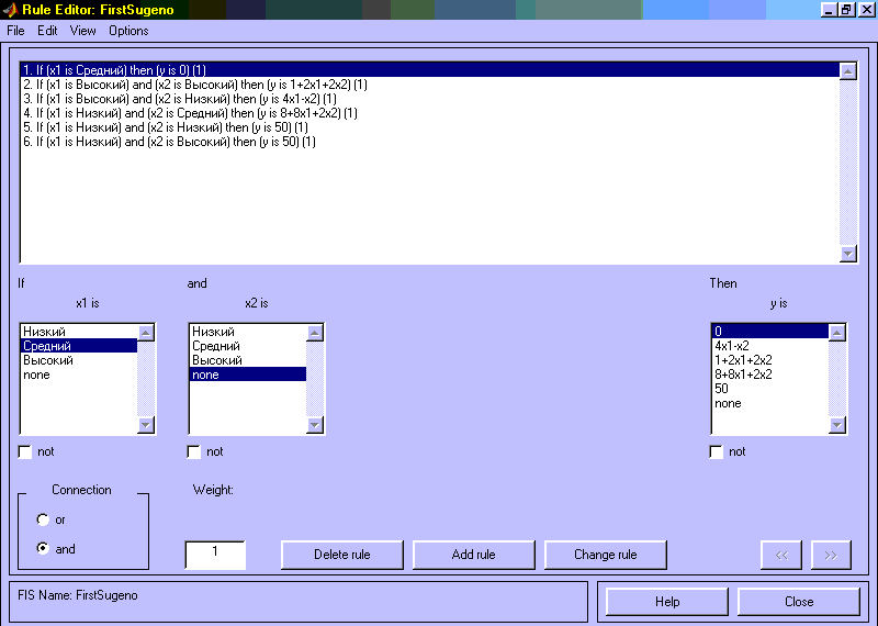 Рис 3.11. Окно линейных зависимостей “входы-выход” Шаг 14. Перейдем в редактор базы знаний RuleEditor. Для этого выберем в меню Edit команду Edit rules.... и введем правила базы знаний. Для ввода правила необходимо выбрать соответствующую комбинацию термов и зависимостей и нажать кнопку Add rule. На рис. 3.12 изображено окно редактора базы знаний после ввода всех шести правил.