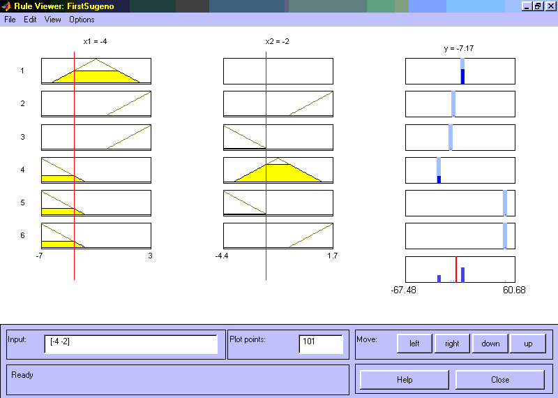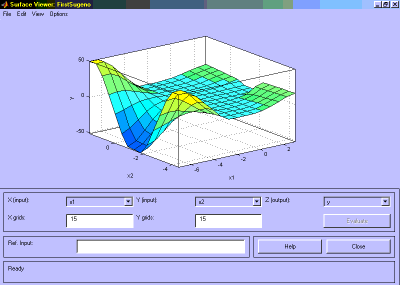 Рис. 3.13 Визуализация нечеткого логического вывода для системы типа Сугэно На рис. 3.14 приведена поверхность “входы-выход”, соответствующая синтезированной нечеткой системе. Для вывода этого окна необходимо использовать команду View surface... меню View. Сравнивая поверхности на рис. 3.1, рис. 3.8 и на рис. 3.14 можно сделать вывод, что нечеткие правила достаточно хорошо описывают сложную нелинейную зависимость. При этом, модель типа Сугэно более точная. Преимущество моделей типа Мамдани состоит в том, что правила базы знаний являются прозрачными и интуитивно понятными, тогда как для моделей типа Сугэно не всегда ясно какие линейные зависимости “входы-выход” необходимо использовать.
