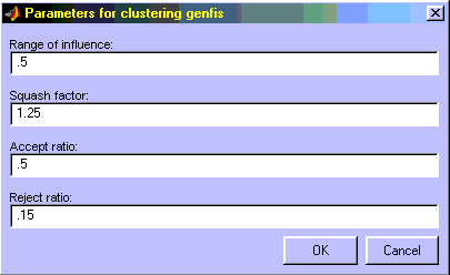 Рисунок 7.24. Окно ввода параметров для метода решетки При выборе Sub. clustering появляется окно ввода следующих параметров метода субкластеризации (рис. 7.25): Range of influence – уровни влияния входных переменных; Squash factor – коэффициент подавления; Accept ratio – коэффициент, установливающий во сколько раз потенциал данной точки должен быть выше потенциала центра первого кластера для того, чтобы центром одного из кластеров была назначена рассматриваемая точка; Reject ratio –коэффициент, установливающий во сколько раз потенциал данной точки должен быть ниже потенциала центра первого кластера, чтобы рассматриваемая точка была исключена из возможных центров кластеров.