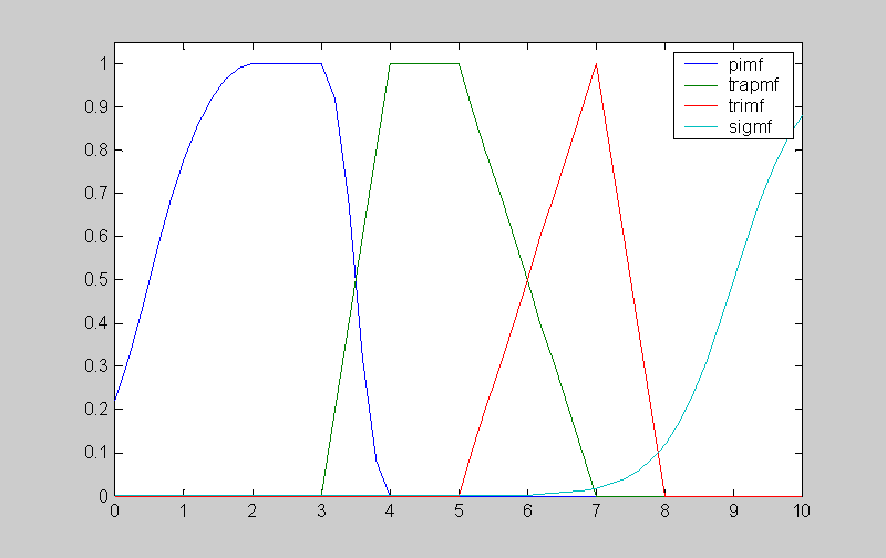 Функция evalmmf возвращает матрицу y, содержащую степени принадлежности координат вектора x. Первая строка матрицы содержит значения первой функции принадлежности, вторая строка – значения второй функции принадлежности и т.д. Пример: x = 0:0.2:10;para = [-1 2 3 4; 3 4 5 7; 5 7 8 0; 2 9 0 0];type = str2mat('pimf', 'trapmf', 'trimf', 'sigmf');mf = evalmmf(x, para, type); =================================================================== Построение графиков пи-подобной, трапециевидной, треугольной и сигмоидной функций принадлежности на интервале [0, 10].
