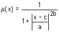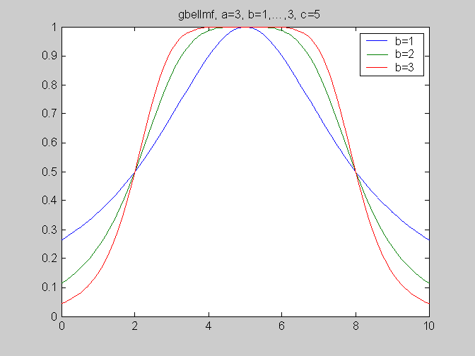 Синтаксис: y = gbellmf (x, params) Описание: Функция gbellmf задает функцию принадлежности в виде симметричной кривой в форме колокола. Эта функция задается формулой a - коэффициент концентрации функции принадлежности; Функция gbellmf применяется для задания гладних симетричных функций принадлежности. Функция gbellmf имеет два входных аргумента: