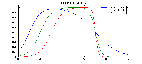 y1 = psigmf (x, [2 1 -1 7]);