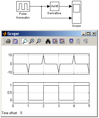Значение входного сигнала блока до начала расчета считается равным нулю. Начальное значение выходного сигнала также полагается равным нулю. Точность вычисления производной существенно зависит от величины установленного шага расчета. Выбор меньшего шага расчета улучшает точность вычисления производной. На рис. 9.3.1 показан пример использования дифференцирующего блока для вычисления производной прямоугольного сигнала. В рассматриваемом примере, для повышения наглядности, шаг расчета выбран достаточно большим.