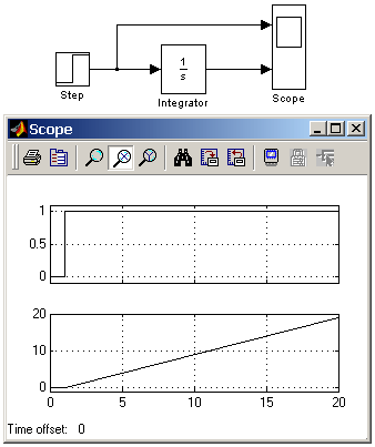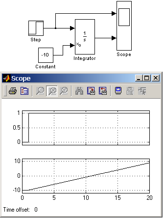 Рис. 9.3.2. Интегрирование ступенчатого сигнала. Пример на рис. 9.3.3 отличается от предыдущего подачей начального значения через внешний порт. Начальное значение выходного сигнала в данном примере задано равным –10.