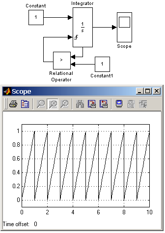 Рис. 9.3.3. Интегрирование ступенчатого сигнала с установкой начального значения выходного сигнала. Пример на рис. 9.3.4 демонстрирует использование входного порта для сброса выходного сигнала и порта состояния интегратора с целью организации обратной связи. Схема работает следующим образом: входной постоянный сигнал преобразуется интегратором в линейно-изменяющийся, по достижении выходным сигналом значения равного 1 блок Relational Operator вырабатывает логический сигнал, по переднему фронту которого происходит сброс выходного сигнала интегратора до начального значения равного нулю. В результате на выходе интегратора формируется пилообразный сигнал, изменяющийся от 0 до +1.