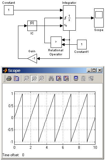 Рис. 9.3.4. Генератор пилообразного сигнала на основе интегратора. Следующая схема (рис. 9.3.5) использует установку начального значения интегратора с помощью его выходного сигнала. В первый момент времени начальное значение выходного сигнала интегратора с помощью блока IC (Initial Condition) устанавливается равным нулю. По достижении выходным сигналом значения равного 1 блок Relational Operator подает сигнал сброса выходного сигнала интегратора на начальный уровень, при этом сигналом, задающим начальный уровень, оказывается инвертированный выходной сигнал интегратора (т.е. -1). Далее цикл работы схемы повторяется. В отличие от предыдущей схемы выходным сигналом генератора является двуполярный сигнал.